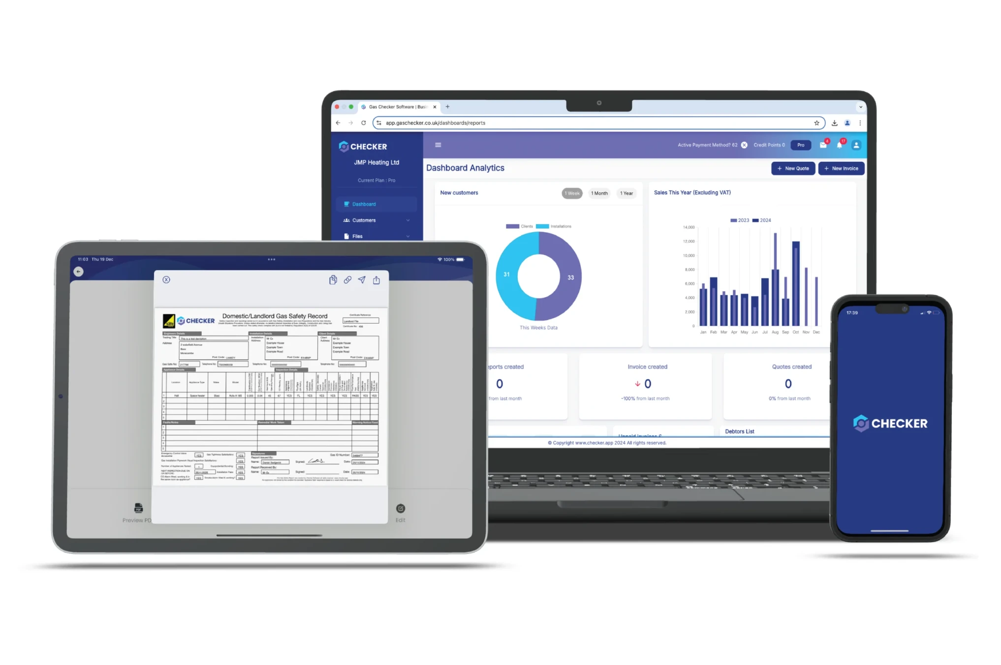 Checker is simple, it allows you to create all your digital records and reports, store them all in one place, create and manage your invoices and quotes, get paid on site and link all of this to your accountancy package such as Xero, Quickbooks or Sage.